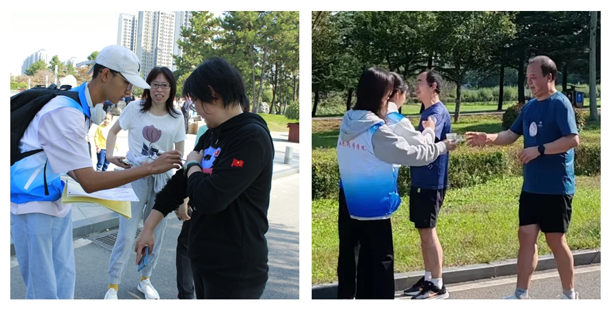 半程折返处、打卡点,志愿者给参赛选手准备了充足的饮用水和零食,为他们补充能量。从起点到终点,从路口到弯道,随处可见的志愿者,在保障跑道安全的同时为参赛选手加油鼓劲,热情忙碌的身影化作一道道靓丽的风景线。